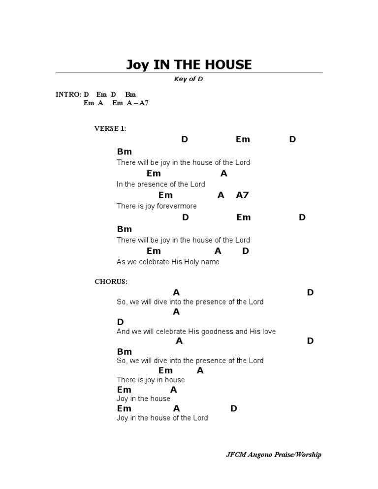 . Theres joy in the house of the Lord Theres joy in the house of the Lord today And we wont be quiet We shout out Your praise Theres Joy in the house of the Lord Our God is surely in this. Take Joy My King. C g f c g f verse1.